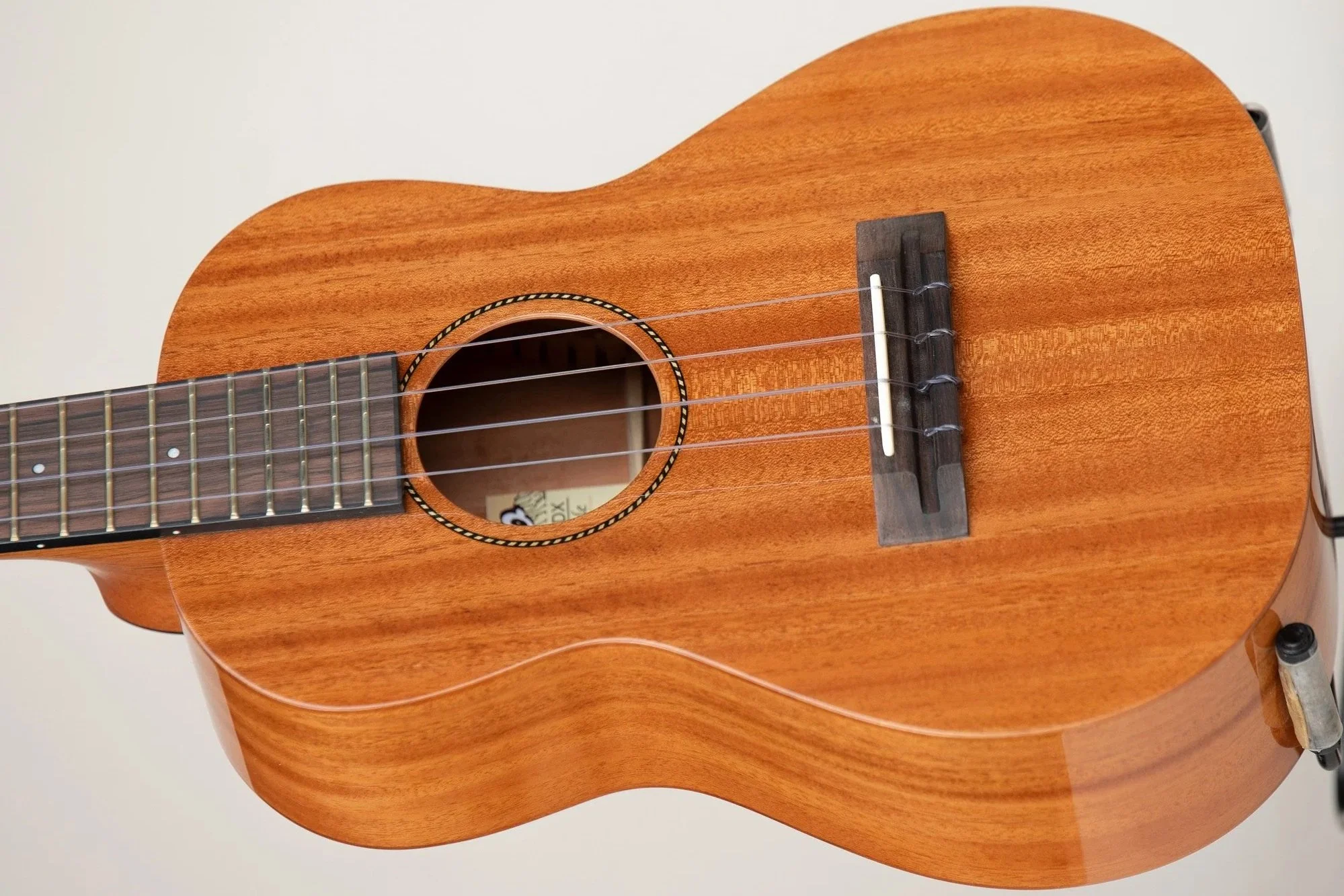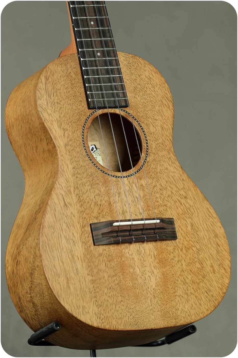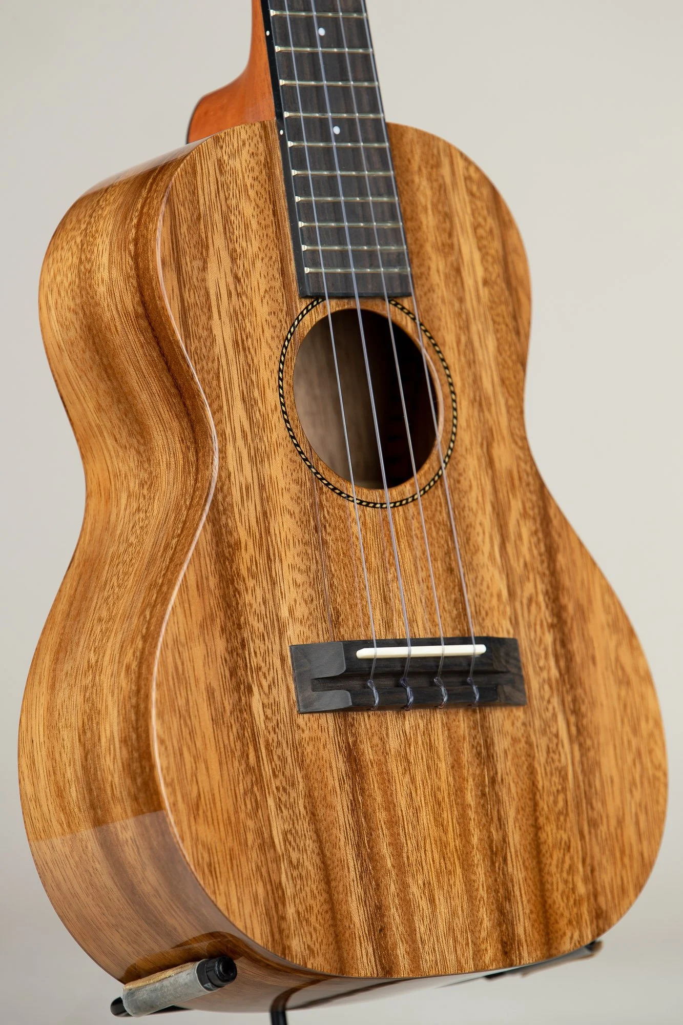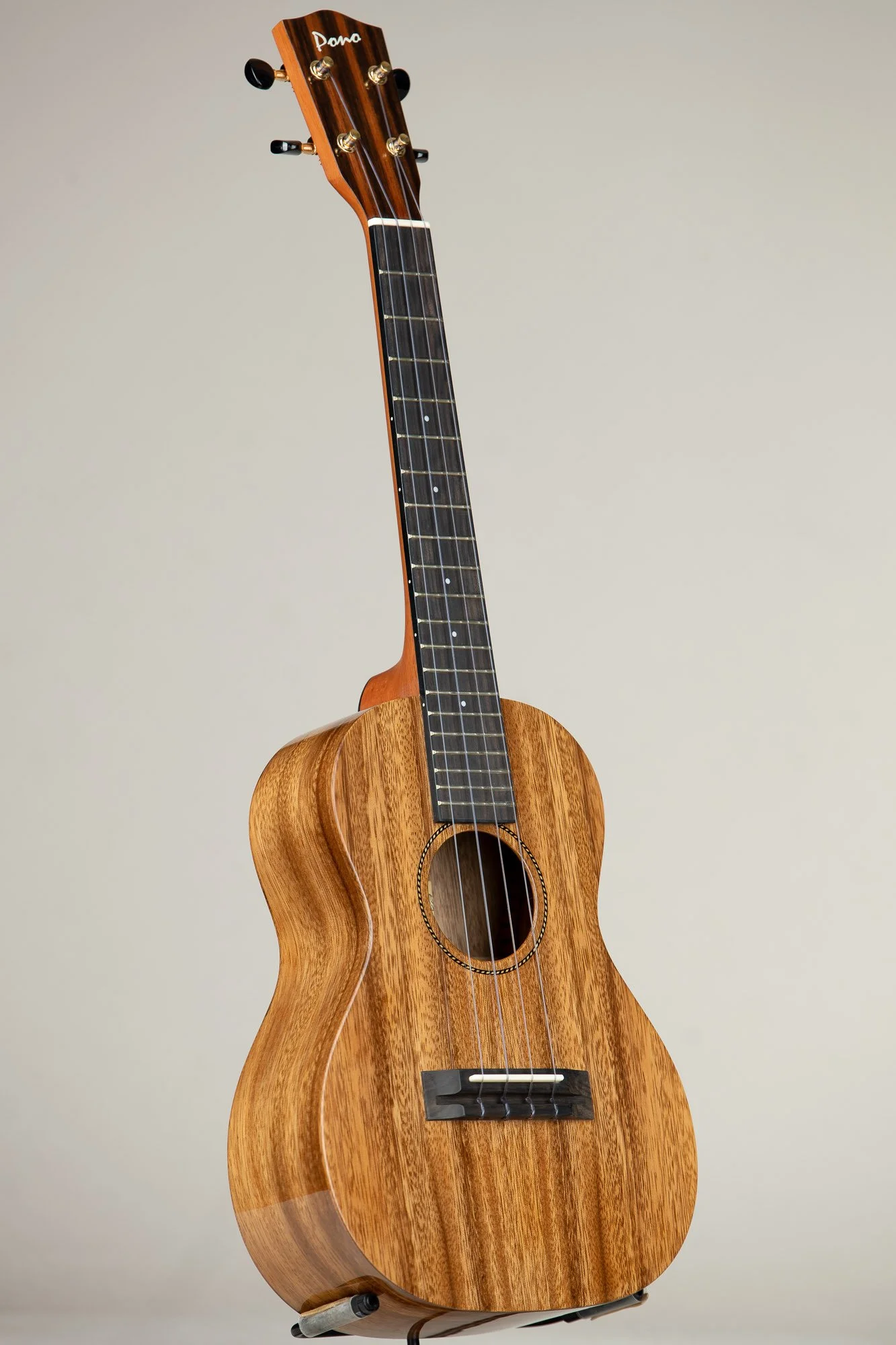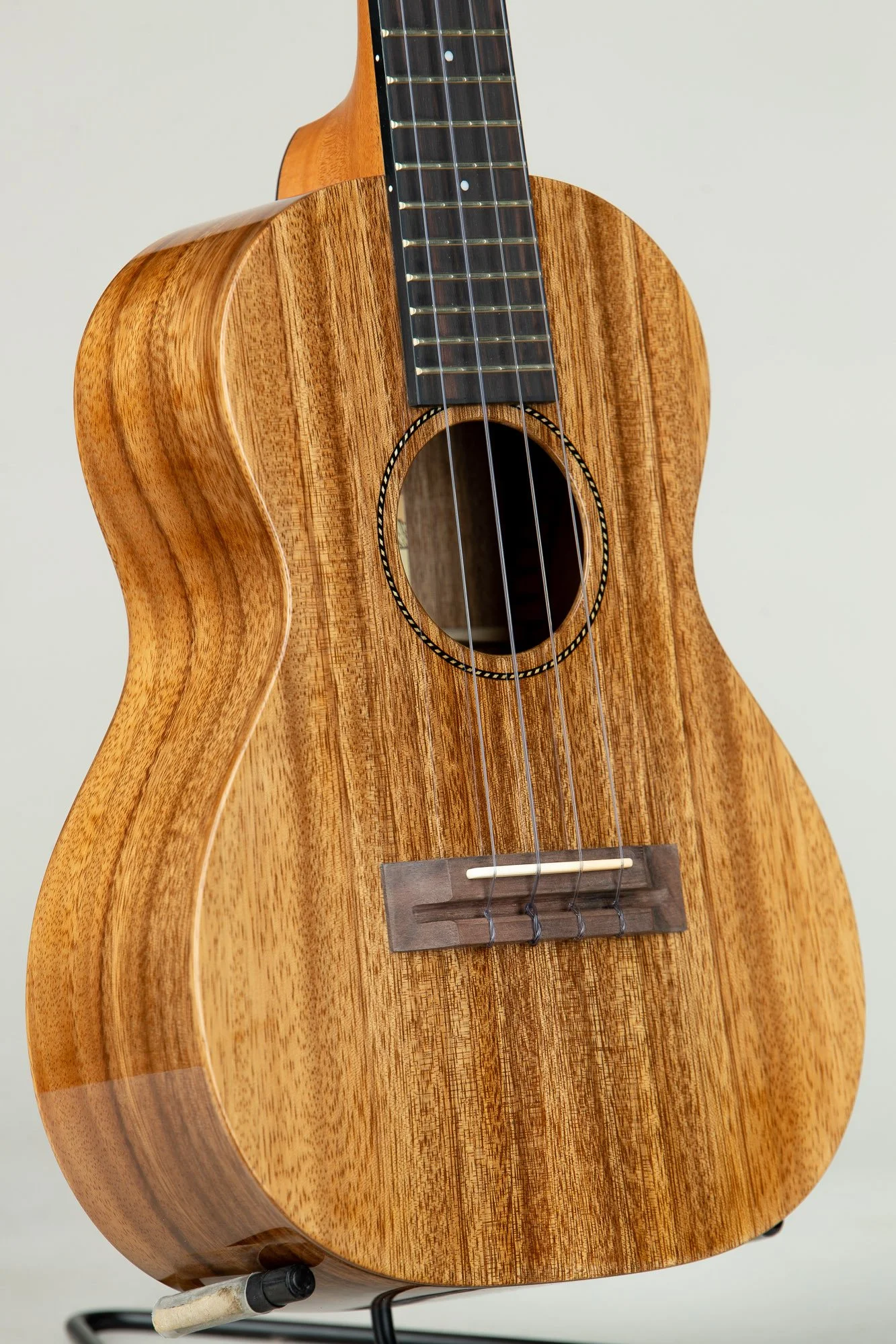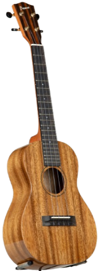 The standard model is available in soprano, concert, tenor and baritone sizes. This model features an ebony faceplate and fingerboard with wood options including mahogany, acacia or mango. There is an option for satin or gloss finish. Complete with a simple yet beautiful rosette. If you want something simple but with a few more features than a base model, this is for you.